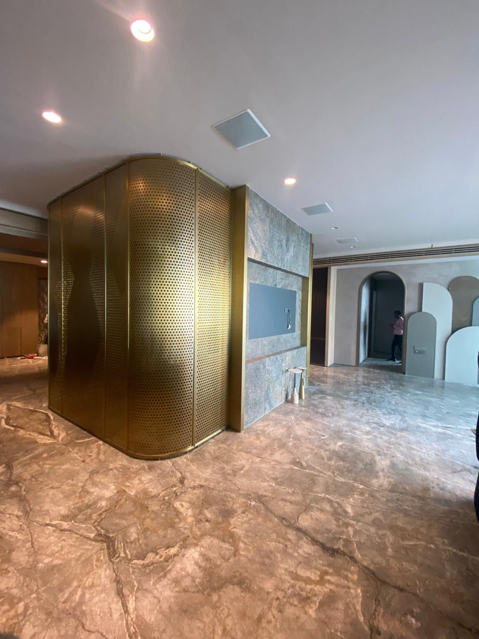 This luxury residential interior has been executed by Kumawat Interiors, showcasing precision craftsmanship and high-end detailing. The space features a custom-fabricated perforated metal partition with curved geometry and brushed gold finish, designed as a sculptural architectural element that defines the space while maintaining visual openness.